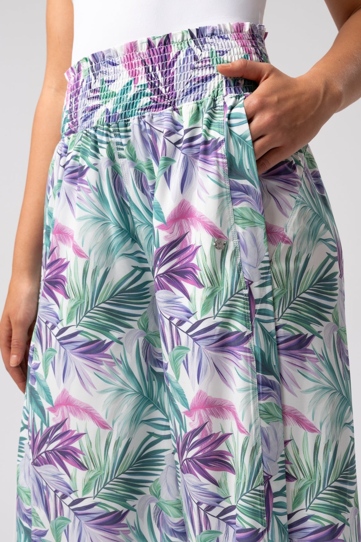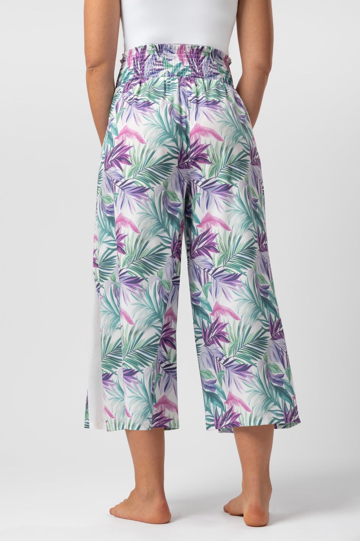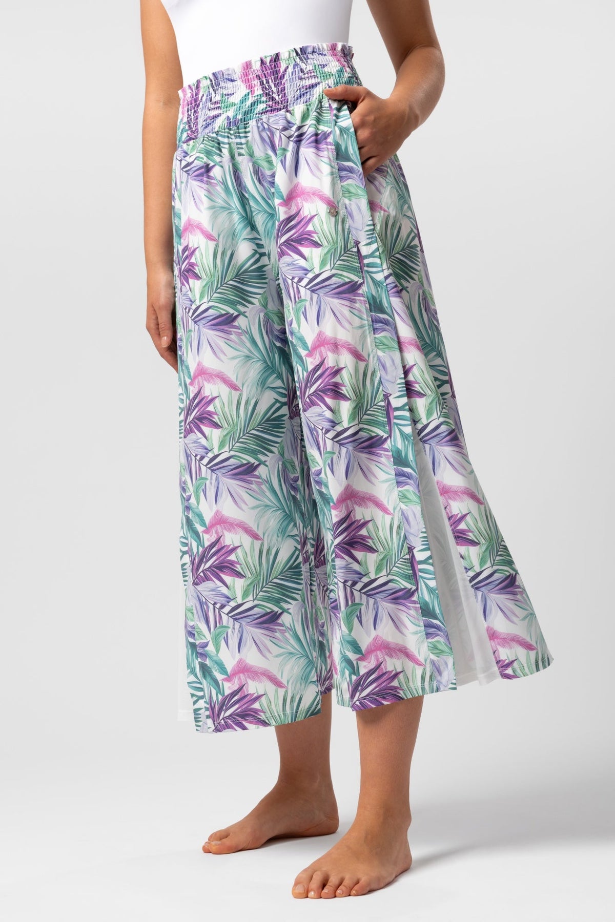 Pantaloni estivi leggeri con drappeggio laterale traslucido